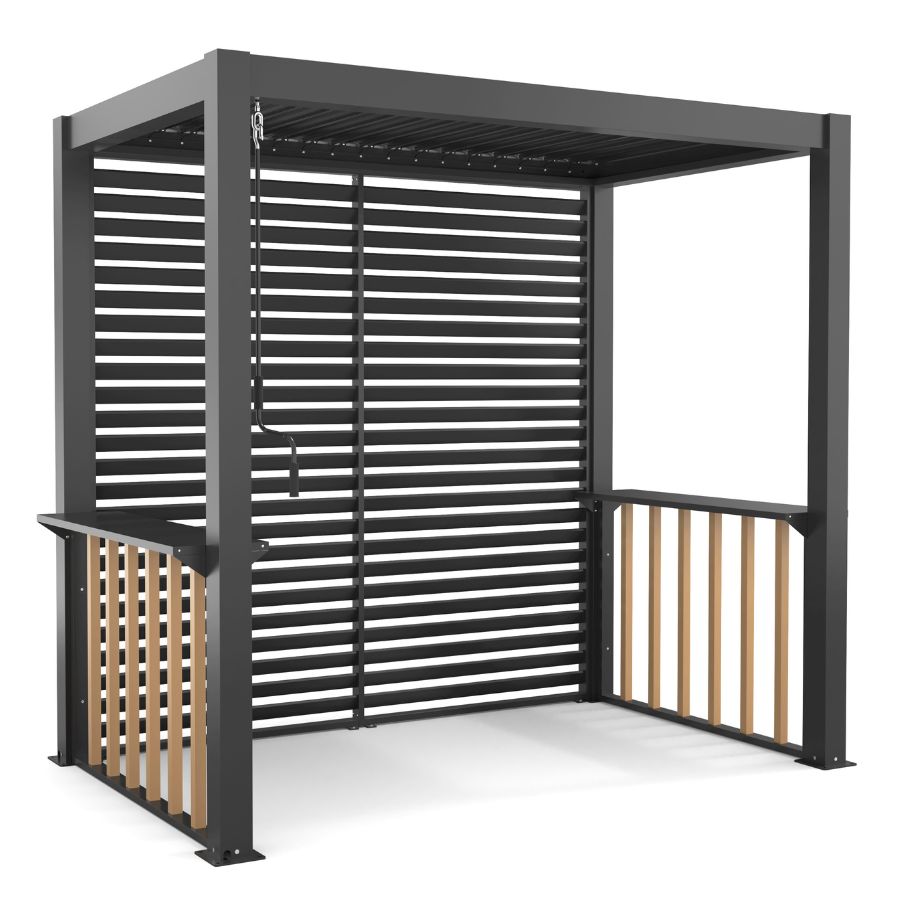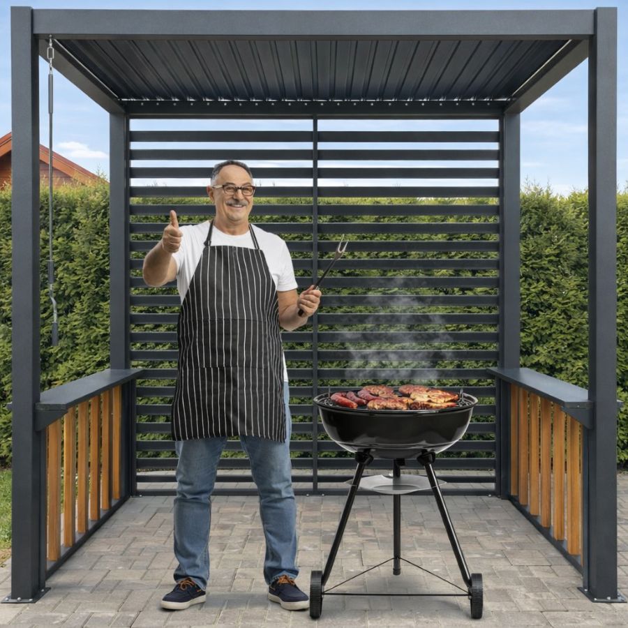 BBQ pergola – tai moderni ir tvirta pergola, skirta griliui ir lauko kepsninei. Ji sukuria saugią, patogią ir nuo oro sąlygų apsaugotą grilio zoną, leidžiančią gaminti maistą lauke bet kokiu oru. Reguliuojamos stogo lamelės užtikrina gerą ventiliaciją, o integruoti šoniniai staliukai suteikia papildomo patogumo. Tai idealus sprendimas tiems, kurie nori komfortiškos, estetiškos ir funkcionalios lauko grilio erdvės.