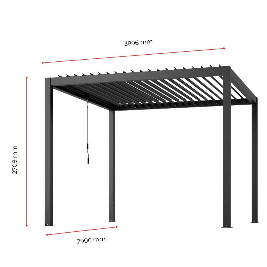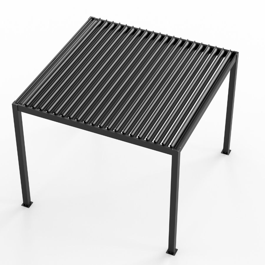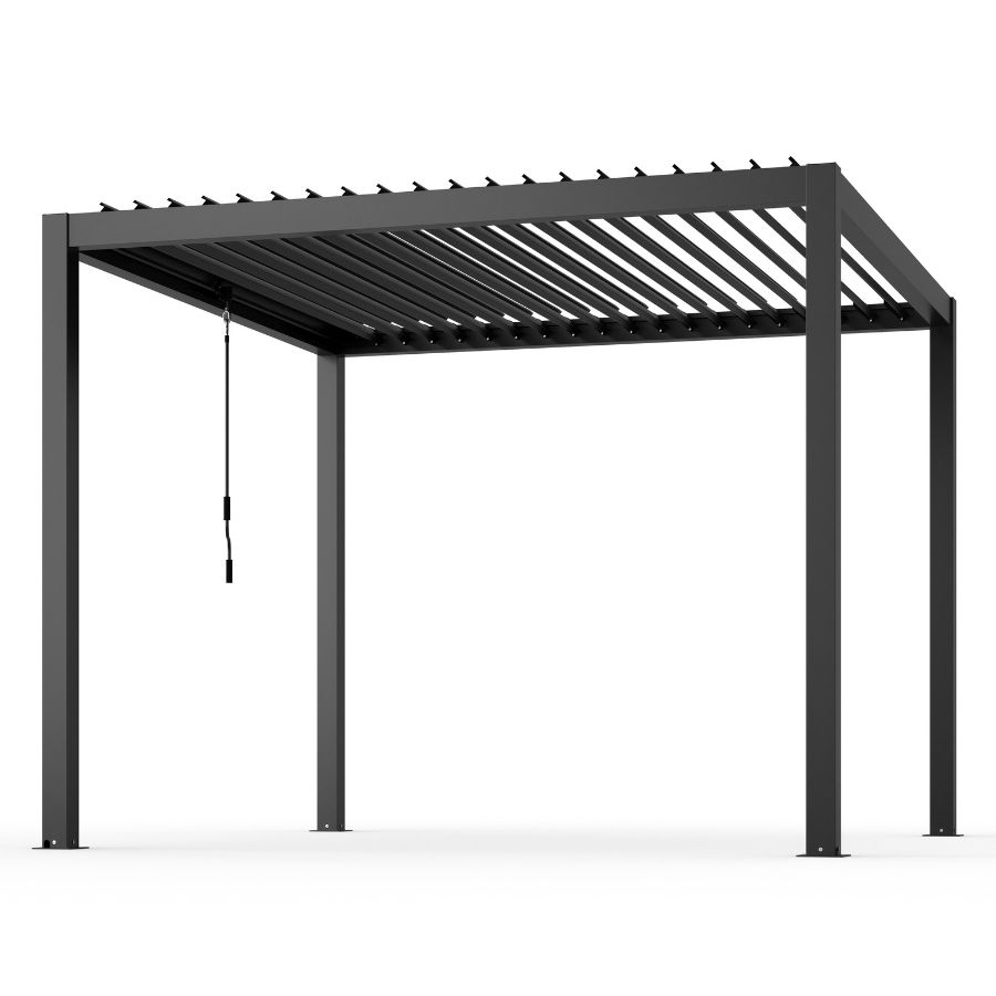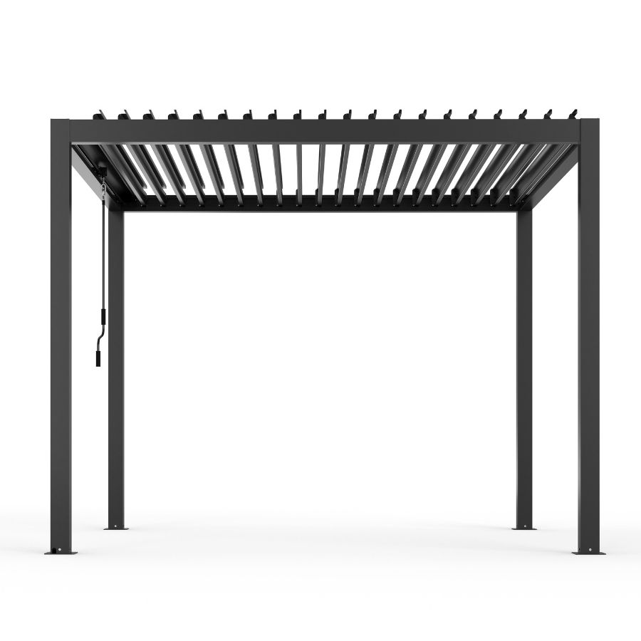 Šiuolaikiška aliuminio pergola – patikimas ir estetiškas sprendimas Jūsų lauko erdvei. Konstrukcija pagaminta iš korozijai atsparaus aliuminio, antracito spalvos, todėl puikiai dera prie modernaus eksterjero ir yra ilgaamžė. Pergolos stogo lamelės vartomos rankiniu mechanizmu, leidžiančiu reguliuoti šviesos ir oro srautą. Pergola turi integruotą lietaus nubėgimo sistemą, kuri efektyviai nukreipia vandenį ir užtikrina komfortą net lyjant.
